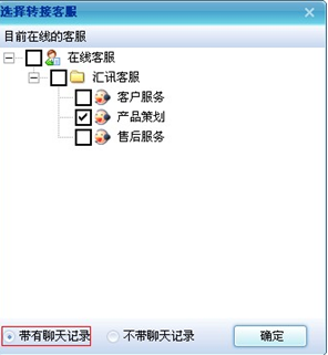 在选择转接客服的选择框中选择好目标客服,点击确定即可。客服人员还可以选择是否将客服人员的对话记录转接给目标客服。