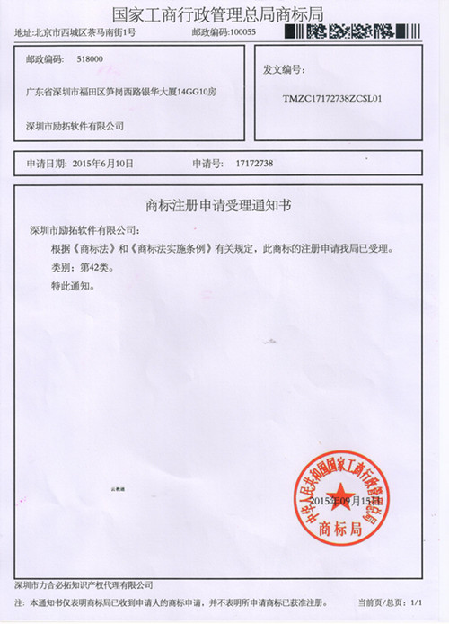 10月13日,从国家工商行政管理总局商标局快递来的喜讯,我公申报的“汇讯”、“校鸽”、“云教通”三大商标已于2015年9月15日注册成功,正式发送申请受理通知书,正式均被核准为第42类注册商标。深圳市励拓软件有限公司的商标获得了注册保护,享有完全商标权益,同时,这也是公司品牌战略里程碑式的标志,该商标的注册成功象征着我司在企业即时通讯平台发展中又迈进了新的一步。